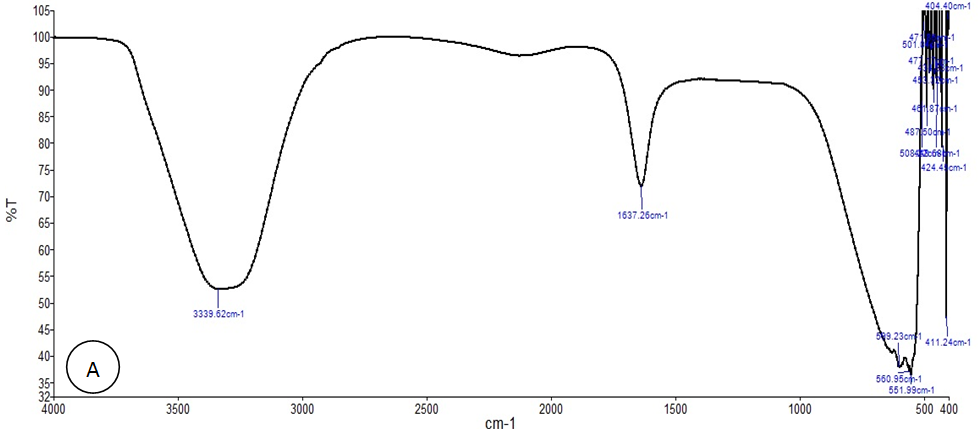 The interaction of gold nanoparticles with biomolecules of aqueous shell extract of P. vera was inferred by FTIR analysis. The FTIR spectra show the functional groups' vibration of P. vera shells extract and biosynthesized AuNPs, respectively (fig. 5). A strong, broad peak recorded at 3339.62 cm-1due to O-H group stretching vibrations indicating the presence of phenol and alcohol. An absorption band appeared at 1637.25 cm-1corresponding to C=C stretching vibrations confirming the presence of alkenes. In the research on biofuel extracted from the shells of pista, the FTIR spectrum was used for the functional group analysis of bio-oil. It was stated that the presence of phenols and alcohols is indicated by the O–H stretching vibrations between 3200 and 3400 cm-1 and the presence of alkenes and aromatics is indicated by the C=C stretching vibrations between 1575 and 1675 cm-1[29]. The depth and width of the band are indicative of the intensity and abundance of the particular functional group in that band [30].