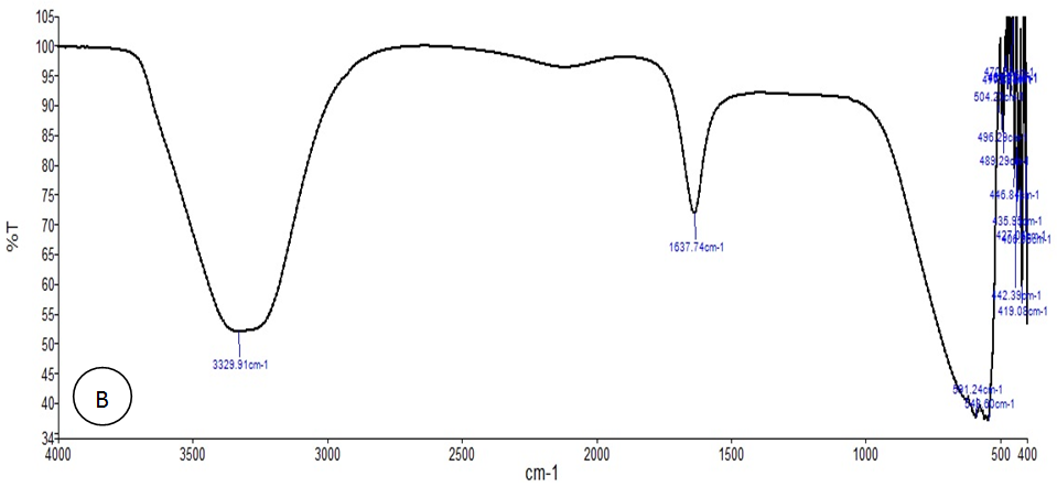Fig. 5: FTIR spectrum (A) aqueous shell extract of Pistacia vera, (B)biosynthesized AuNPs