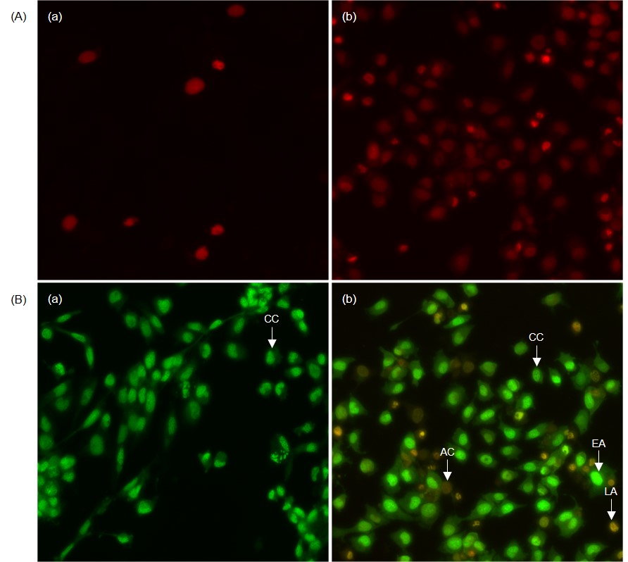 Fig. 7: Morphological changes of apoptotic cells stained with (A) propidium iodide (PI) and (B) acridine orange and ethidium bromide (AO/EB) under fluorescence microscopy. (a) PA1 control cells, (b) AuNPs treated PA1 cells. CC–Control cells, EA–Early apoptotic cells, AC–apoptotic cells, LA–Late apoptotic cells
