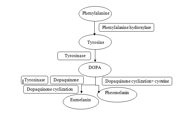 The melanocytes produce the pigmentmelanin which is responsible for the colour of the skin, eyes,and hair. During the process of keratinisation, melanin is transferred to the keratinocytes. The main function of the melanin is to protect the skin from the UVR. The melanin pigment is classified into two types, particularly into Eumelanin and Pheomelanin [12]. The schematic representation of melanin synthesis has been depicted in fig.1.