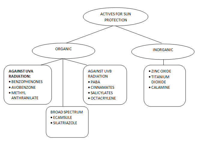 Sunscreen agents can be broadly classified based on their capacity to absorb, scatter or reflect sunlight. High energy UVR is absorbed by chemical sunscreens while physical sunscreens scatter and reflect the rays [21]. Chemical agents can be organic compounds,and a combination of organic and inorganic compounds can be incorporated into a formulation for obtaining broad spectrum formulation (fig. 3).