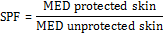 MED protected skin-minimum erythemal dose for protected skin after application of 2 mg/cm2 or 2ul/cm2 of the final formulation of the sunscreen productMED unprotected skin-minimum erythemal dose for unprotected skin, i.e. Skin with no sunscreen