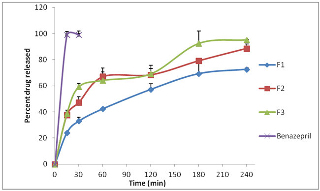 Fig. 1: Benazepril HCl release from formulations (F1–F3) and pure drug (n=3) (mean±standard deviation)