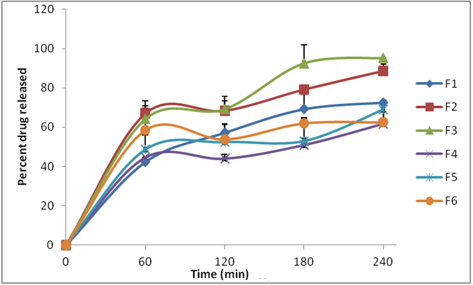 Increasing the amount of cholesterol from 100 mg in F1, F2 and F3 to 400 mg in F4, F5 and F6 while fixing the quantities of surfactants led to a profound retardation effect(p<0.05) on the drug release rate as shown in (fig. 2). Cholesterol was employed in this study as a stabilizing agent that strengthens the cohesion and membrane rigidity. Therefore; it decreased drug permeability across the bilayered vesicles [24].