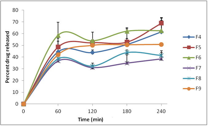 Formulations F7, F8 and F9 exhibited the desired sustained release profile as they released only 38.4%, 41.4% and 50.8% respectively at the end of 4 h. The least the drug released from the carrier vesicles, the higher encapsulated within to be absorbed at the absorption site in the gastrointestinal tract.