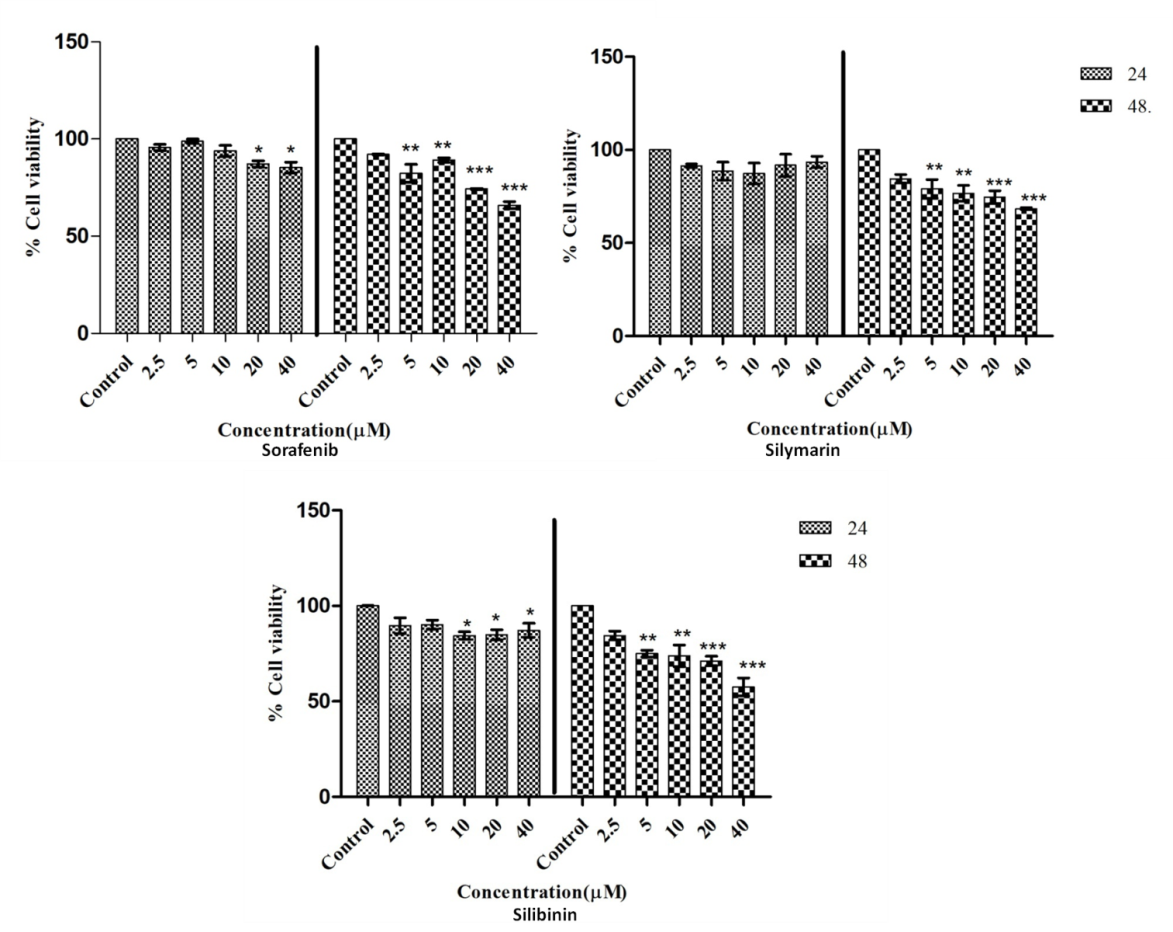 Dose and time dependent effects of sorafenib, silymarin and silibinin were determined at different concentrations (2.5, 5, 10, 20 and 40 μM) in HepG2 cells by performing MTT assay. As shown in fig. 1. All the three compounds did not exhibit any significant effect at 24 h. However at 48 h, cell viability was significantly reduced to 87%, 88%, 74% and 67% (P<0.001) at 5-40 μM concentration of sorafenib. Further, plant based compound, Silymarin also showed significant effect at 48 hr showing reduced cell viability from 78% to 67% (P<0.001) at concentrations of 5–40 μM. Similar trend was exhibited by another plant based compound, Silibinin that reduced the cell viability by 84%, 75%, 66%, 71%, and 65% (P<0.001) at 48 h incubation with 2.5-40 μM concentration.