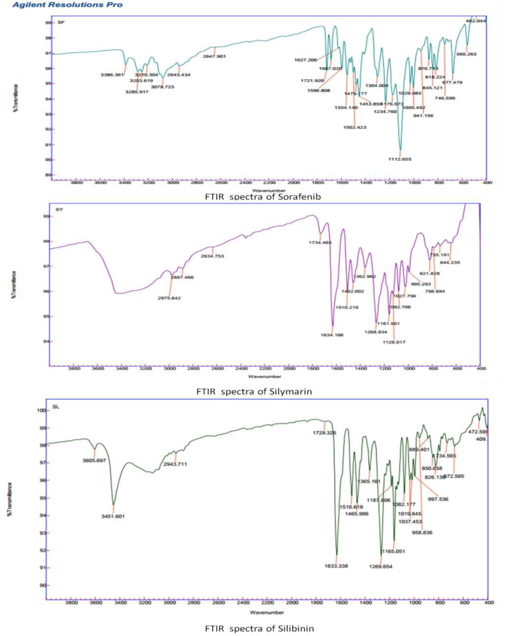 Fig. 2A: FTIR spectra of individual drugs (Sorafenib, Silymarin and Silibinin)