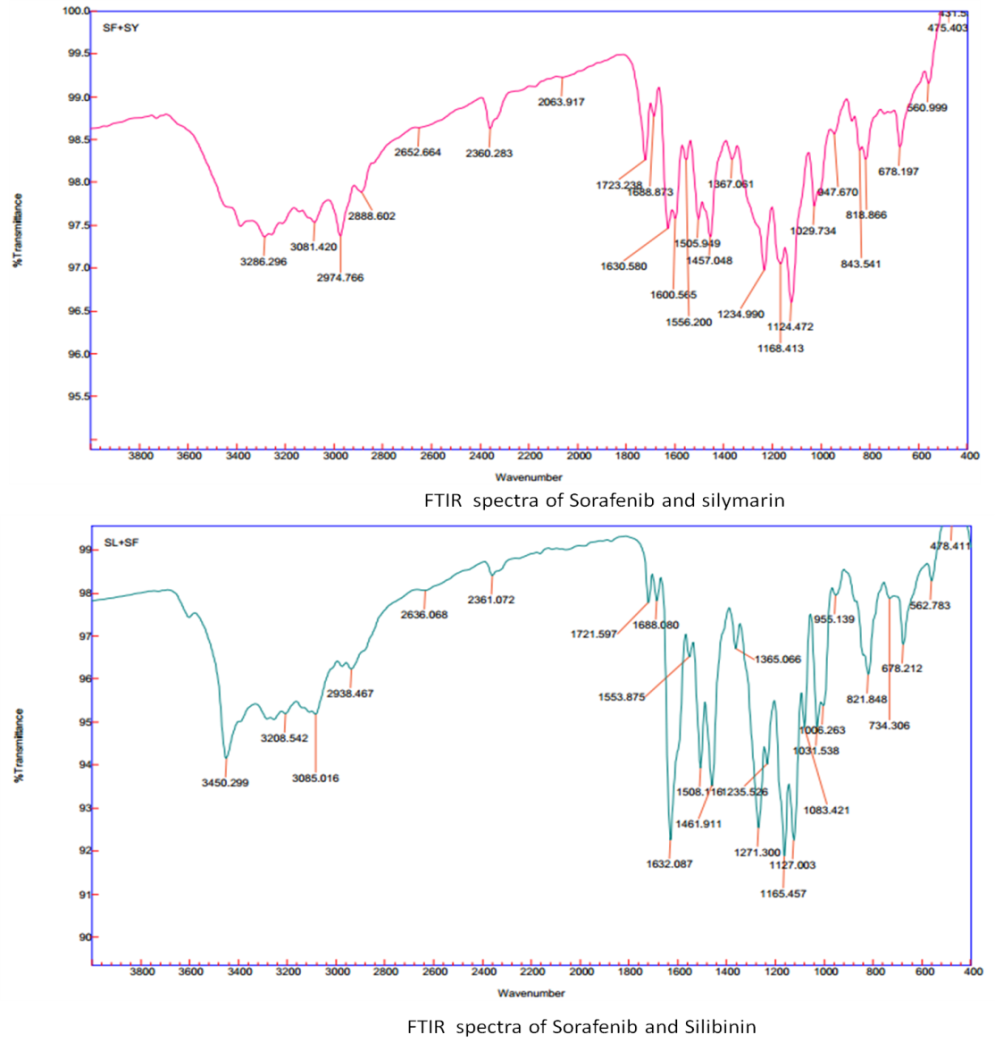 The drug-drug interaction has been performed using ATR-FTIR (Attenuated total reflection-Fourier transform infrared spectroscopy, Cary 660 FTIR spectrometer-Agilent Technologies) procedure. Sorafenib, silibinin and silymarin individually and in combination (sorafenib-silymarinand sorafenib-silibinin in 1:1 ratio) diluted with chemically latent compound KBr for pellet preparation. These pellets were scanned from 4000 to 400 cm−1 on FTIR for spectra analysis.