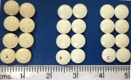 Fig. 3: Combination tablets A) formulation 1; B) Formulation 2; C) Formulation 3