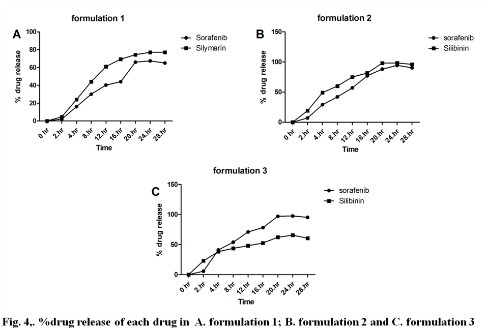 Enteric coating pullulan did not show any release in 0.1N HCl within 2 h in each formulation. The dissolution medium was changed with phosphate buffer and the drug release was observed. In formulation 1 sorafenib released up to 67% whereas in same formulation silymarin has released up to 90 %. Formulation 2 showed release of 98% for both sorafenib and silibinin. On the other hand, formulation 3 showed moderate release of both drugs that was 73% and 84% for sorafenib and silibinin, respectively. The P value was less than 0.001 for each formulation showed its significance. Due to controlled release medium each formulation has taken minimum 28 hr to release its maximum amount (fig. 4)