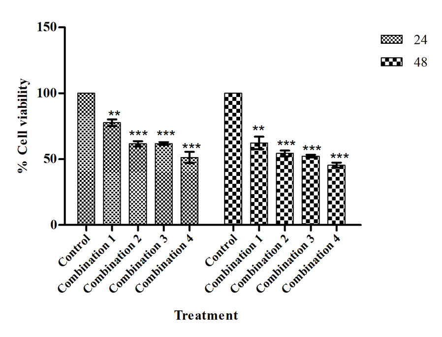 Fig. 5: Percent viability of Hep G2 cell line after combination of drugs exposure, (n=5; mean+SD; **P<0.01and ***P<0.001 as compared to control cells)