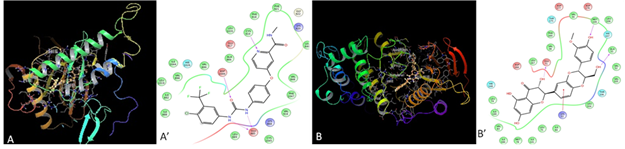 Fig. 6: Docking poses of (A and A’) Sorafenib with VEGFR-β (vascular endothelial growth factor receptor β) and (B and B’) Silibinin with p38 (Mitogen-activated protein kinase 11)