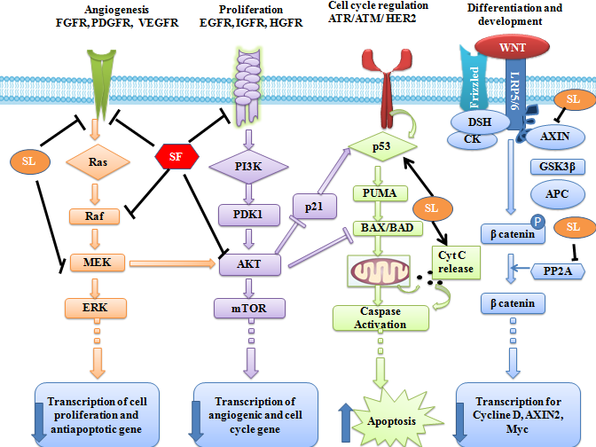 Fig. 7: The target proteins which are involved in hepatocarcinogenesis can be inhibited by sorafenib (SF) and silibinin (SL). Sorafenib has antagonist effect of vascular endothelial growth factor receptor (VEGFR-β), proto-oncogene B-Raf and protein kinase B-1(AKT-1). However, silibinin is involved in inhibition of mitogen-activated protein kinases (p38), AKT, Protein kinase B, tankyrase and protein phosphatase 2 A (PP2A). MEK kinases (MEK); extracellular signal-regulated kinase (ERK); phosphatidylinositol-3-kinase (PI3K); Insulin-like growth factor receptor (IGFR); Pyruvate dehydrogenase lipoamide kinase isozyme 1 (PDK1); Mammalian target of rapamycin (mTOR); Tumor protein p53 (Tp53); p53 unregulated modulator of apoptosis protein (PUMA); BCL-2-associated death promoter (BAD); a family of G-protein-coupled receptor proteins for WNT/β-catenin signalling pathway (Frizzled); Low-density lipoprotein receptor-related proteins 5 and 6 (LRP5/6); Downstream effector Dishevelled (DSH); Glycogen synthase kinase 3β (GSK-3β,); a G-protein signalling molecule (AXIN); Casein kinase (CK); Adenomatous polyposis coli (APC)