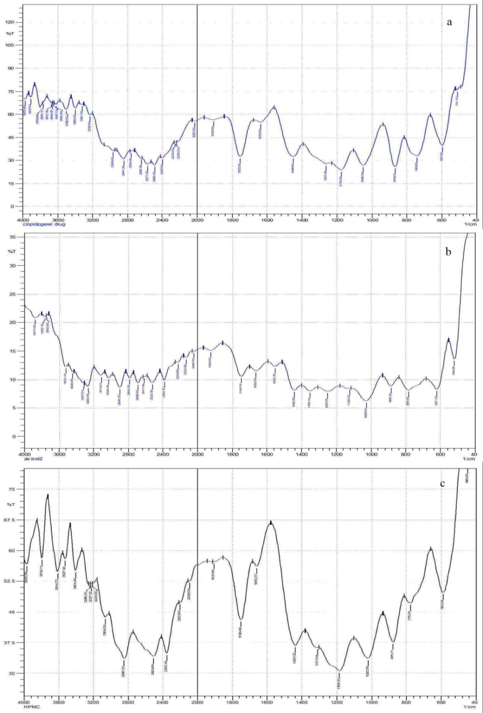Fig. 1: FTIR spectra of (a) clopidogrel bisulphate (b) clopidogrel bisulphate and avicel mixture (c) clopidogrel bisulphate and HPMC K15 mixture