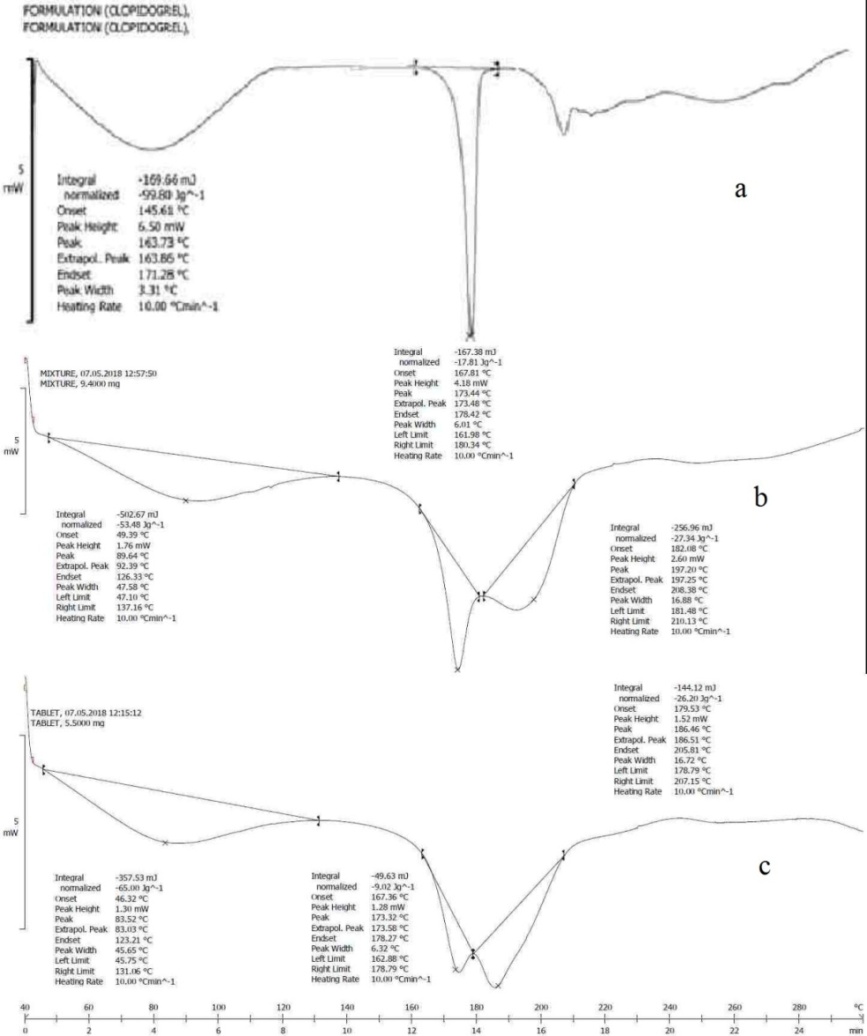 Fig. 6: DSC of (a) clopidogrel bisulphate (b) a physical mixture of drug and excipients (c) tablet formulation F8