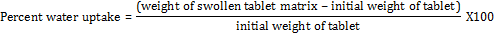 The swelling study of clopidogrel bisulfate tablets was conducted in order to study polymer swelling and rate of test medium uptake by tablets. The preweighed tablets were placed in a USP type II dissolution test apparatus. The test medium used was pH 2.0 hydrochloric acid buffer solution maintained at 37±0.5 °C and 50 rpm. At regular intervals viz., 1, 2, 3, 4, 5, 6, 7 and 8 h, tablets were removed from the dissolution media, lightly blotted with tissue paper to remove excess dissolution fluid and weighed [19].