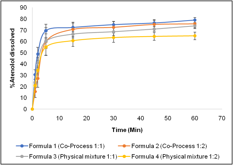 The result showed that formula 1 which using co-process crospovidone-sodium starch glycolate 1:1 release the highest amount of atenolol in 60 min among all formulas. Statistical analysis of area under the dissolution curve (AUC) using one-way ANOVA represented that there was a significant difference (p<0,05) between formulas which using co-process and physical mixture crospovidone-sodium starch glycolate. The results also revealed that formula 1 had shown the highest dissolution efficiency and the most rapid drug dissolution among all formulas. The rapid drug dissolution may be due to the presence of co-process superdisintegrants, which swells due to the rapid uptake of water from medium resulting in the breakdown of the tablet into smaller particles with the increased surface area, and hence increase the release of the drug into the dissolution medium [27, 28].