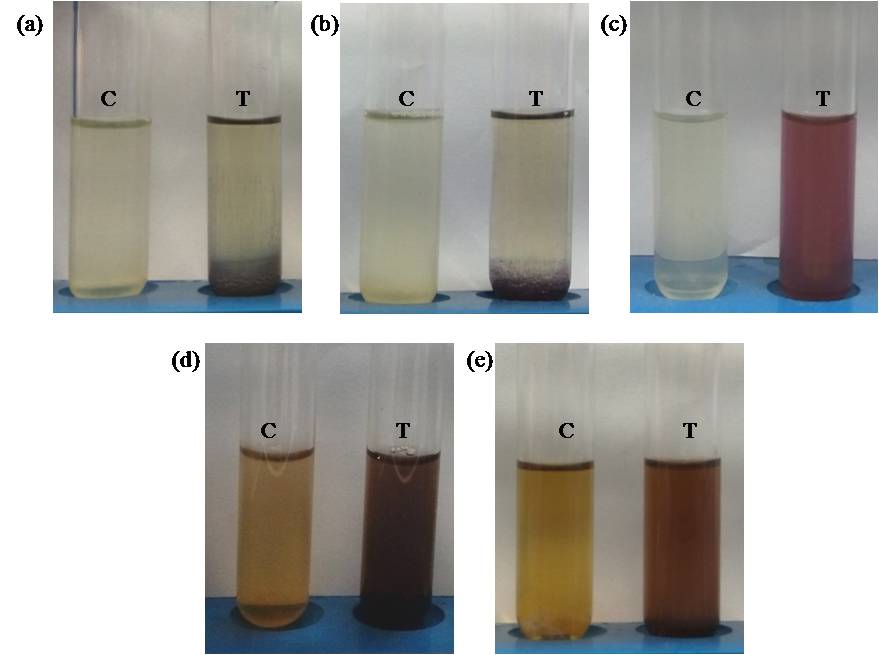 Fig. 1: Biogenic synthesis of gold nanoparticles (AuNPs) using different plants. (a) Cassia javanica, (b) Melia azedarach, (c) Marsilea quadrifolia, (d) Stachytarpheta jamaicensis and (e) Spathodea campanulata