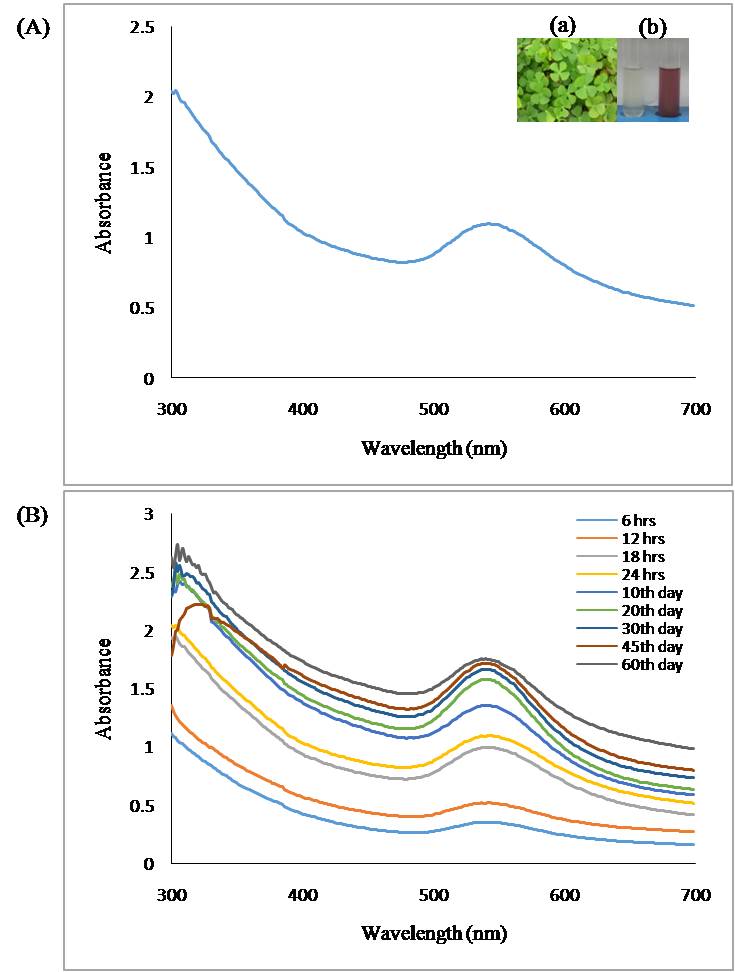 Fig. 2: (A) UV-Vis spectrum of biogenic AuNPs synthesized from Marsellia quardifolia aqueous leaves extract. Inset (a) habitat, (b) biogenic AuNPs synthesized, (B) Stability of AuNPs at different time durations. Abbreviations: h (n=9)