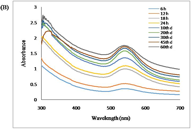 The formation of phytosynthesized AuNPs was confirmed by measuring the absorption spectra between 300-700 nm in PC based Systronics double beam spectrophotometer 2202. The stability of the biogenic AuNPs was recorded at different time intervals such as 6 h, 12 h, 18 h, 24 h, 10th day, 20th day, 30th day, 45th day and 60th day. The absorbance was measured using the above-mentioned instrument.