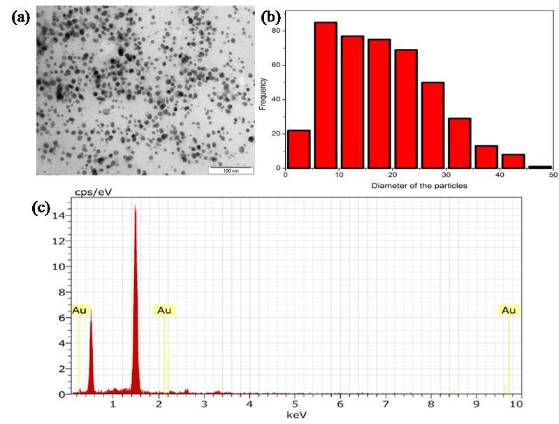 Fig. 3: Characterization of biogenic AuNPs. (a) TEM image of spherical shaped AuNPs, (b) Size distribution of particles, (c) EDX spectrum