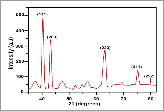 The XRD pattern revealed five distinct peaks at 38.21 °, 44.39 °, 64.62 °, 77.59 ° and 82.09 ° corresponding to (111), (200), (220), (311) and (222) planes respectively (fig. 4), representing the face-centered cubic (fcc) structure of the AuNPs. The data obtained was matched with the database of joint committee on powder diffraction standards (JCPDS) file No. 65-2870, indicating that the biogenic AuNPs are crystalline in nature. Much similar to our present report, Fazaludeen et al. [25] has reported the XRD patterns for gold nanoparticles synthesized using Justicia gendarussa leaf extract.