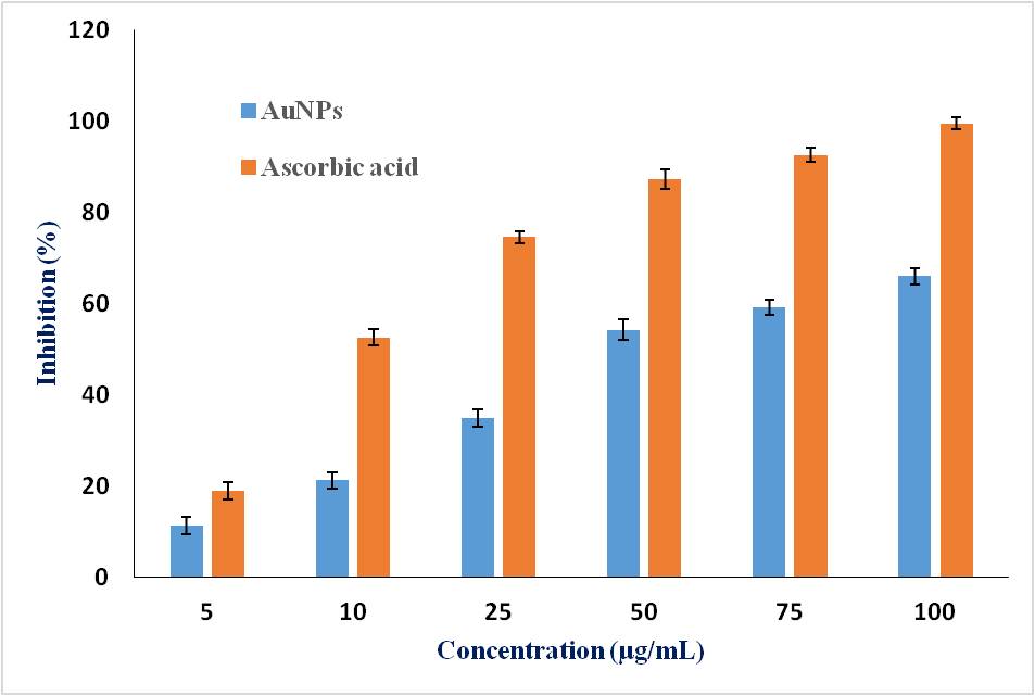 Fig. 5: Antioxidant activity of biogenic AuNPs, values are given as mean±SD for each concentration (n=6)