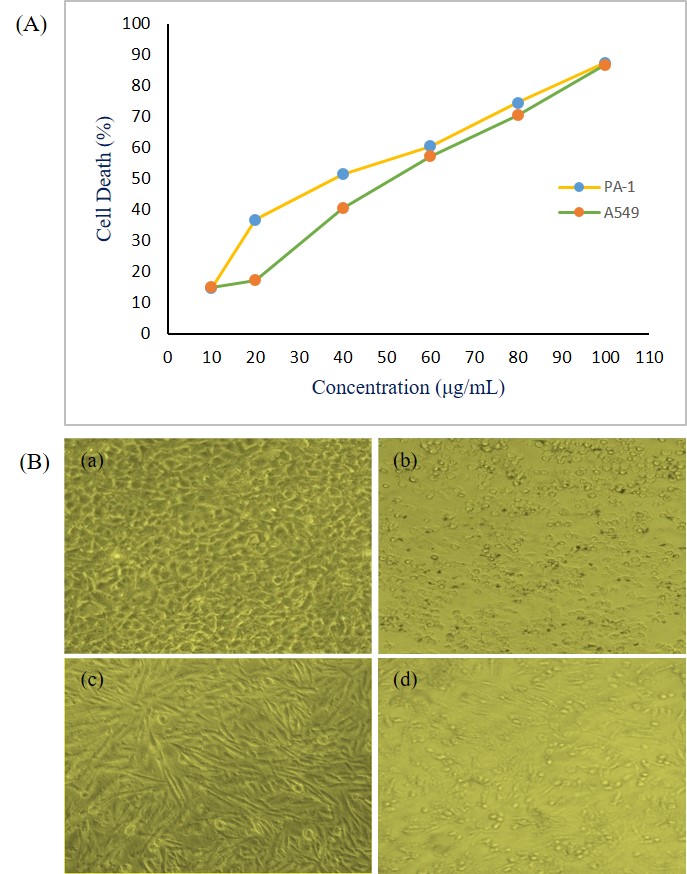 Fig. 6: (A) Cytotoxicity of different concentration of biogenic AuNPs on PA1 and A549. (B) Cytotoxic effect of AuNPs on PA1 and A549 cell line. (a) and (c) Control, (b) and (d) IC50 treated cells, respectively. Values are given as mean±SD for each concentration (n=6)