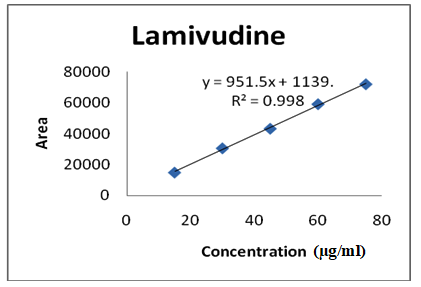 From the stock solution, inject each level into the chromate-graphy system and measure the peak area. Plot a graph of peak area versus concentration and calculate the correlation coefficient. The correlation coefficient obtained was 0.99 which is in the acceptance limit. The linearity range was found to lie from 15 µg/ml to 75 µg/ml of LAM 30 µg/ml to 150 µg/ml of RAL and chromatograms were shown below as shown in fig. 4-5 and table 3.