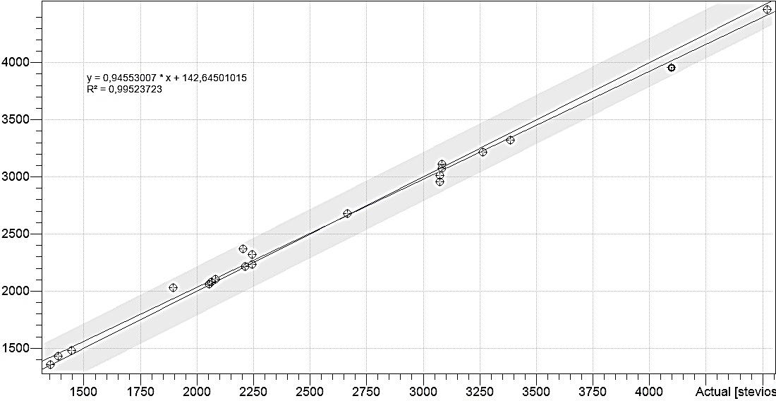 | Stevioside | Original | 1068-1539 | y = 0.8660x+347.62 | 0.9068 | 1.77 |