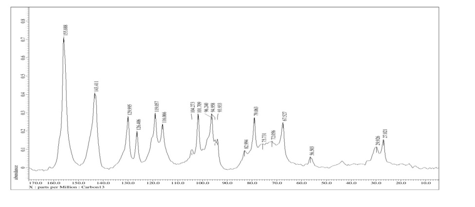 The NMR spectra of biopolymer isolated from Santalum album(White sandalwood) revealed that the peaks were found to be 27.021 ppm which showed presence of C-C, 79.063 ppm which showed presence of C-O, 119.05 ppm which showed presence of C=C, 143.41 ppm which showed presence of C=C, 155.88 ppm which showed presence of C=O preferably. Hence it clearly indicated that bio-polymer was polymeric in nature (fig. 4).