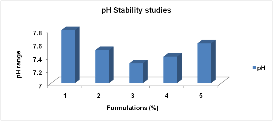 The pH values were measured at 25 °C using a digital pH meter at 20±1 ◦C. The formulation was brought in contact with the electrode of pH meter and equilibrated for 1 min. This method was done in triplicate and mean was calculated along with standard deviation.
