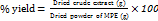 Dried powder of mangosteen peel was macerated with methanol (ratio 1:5) for 12 h (2 times) at room temperature. The extract was filtered through Whatman filter paper No. 1 and concentrated under reducing pressure. The crude extract was dried using hot air oven at 50°C and ground to obtain MPE. The percentage of yield was calculated by the following equation 1. Quantification of α-mangostin in MPE was determined with high-performance liquid chromatography (HPLC, Shimadzu, Kyoto, Japan), equipped with LC-10ATvp pump, SPD-10A UV detector and a reversed phase Vertisep C18 column (5 µm, 4.6x250 mm). The mobile phase consisted of 0.2% orthophosphoric acid and acetonitrile (10:90, v/v). The analysis was conducted at a flow rate of 1 ml/min with the UV detector set at 320 nm. MPE was kept at 4°C in a tight and light protected container until used.