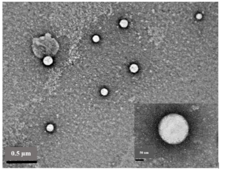 Upon dilution with water, the TEM micrograph of the MPESD at the mass ratio of 1:4:0.5 showed spherical micelles with a mean particle size of ~120 nm, fig. 1. The forming micelles were composed of the MPE enclosed by PVP K30 and poloxamer 188. Thus, the MPESD has been demonstrated to improve the water solubility of α-mangostin.