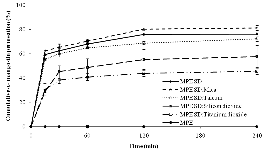 The physical mixtures also exhibited higher α-mangostin water solubility than MPE. This could be explained by the hydrophilicity of polymer increases wettability and dispersibility of drug in the medium, and thus, reducing interfacial tension between the hydrophobic drug and the aqueous medium [15]. Nevertheless, MPEPM showed lesser α-mangostin water solubility than MPESD confirming no interaction between α-mangostin and carriers.