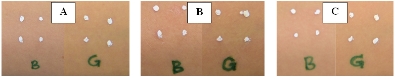 Fig. 3: Representative Photographs of inner forearm assessment at A) baseline, before patch application, B) 0.5 h after removing patch and C) 24 h after removing patch. The area (B) was treated with positive control and area (G) was treated with MPESD-based clay facial mask