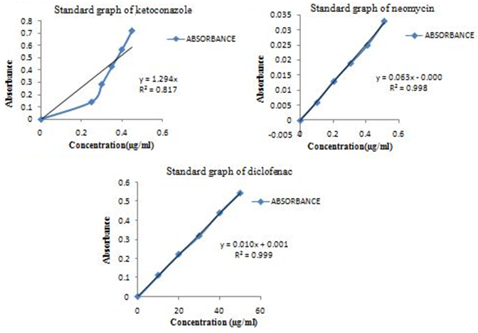 Absorbance values of ketoconazole, neomycin and diclofenac are shown in (table 2) and standard graphs were plotted between concentrations on X axis, absorbance on Y axis (fig. 3).