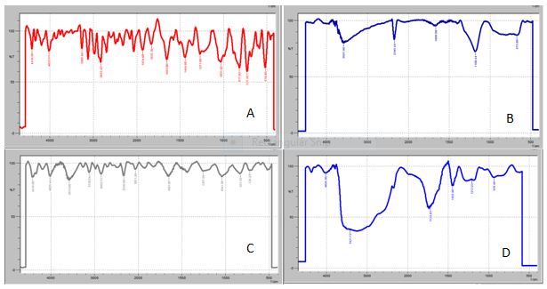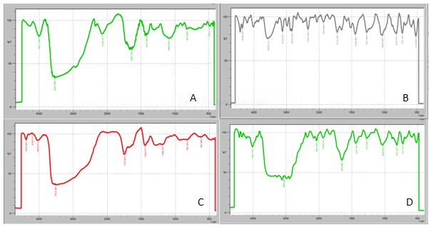Fig. 5: FTIR spectra of A) Xanthan Gum, B) Carbopol 934+Ketoconazole, C) Carbopol 934+Neomycin and D) Xanthan Gum+Ketoconazole