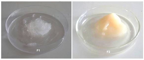 Fig. 7: The prepared gels F1 (carbopol 934) and F2 (xanthan gum) as gelling agents