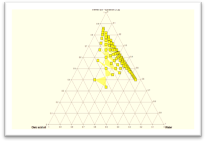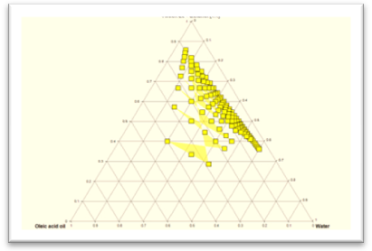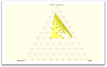 Pseudo-ternary phase diagrams were constructed by aqueous titration method to examine the formation of O/W NE using four components: oil (oleic acid), surfactant (tween 80, tween 60, and tween 20), co-surfactant (ethanol), and an aqueous phase. The diagrams of triangular coordinate were constructed using different combination of surfactant/co-surfactant mixtures (Smix) including (tween 80: ethanol, tween 60: ethanol and tween 20: ethanol) at the desired ratios (1:1, 1:2, 2:1) as listed in the table (1). Emulsion area boundaries were programed using different ratios of oil to Smix ranging from (1:9 to 9:1). As DDW was added drop by drop to the mixture of oleic acid with Smix under gentle stirring. If turbidity appeared, followed by phase separation, the samples were considered to be biphasic. If clear and transparent mixtures were visualized after stirring, the samples were considered monophasic. The samples were marked as points in the phase diagram. The area covered by these points was considered to be the nanoemulsion region of existence [11, 12]. The larger the area of the emulsion in the phase diagram was selected as the best NE composition for further study because of its better hydration capacity.