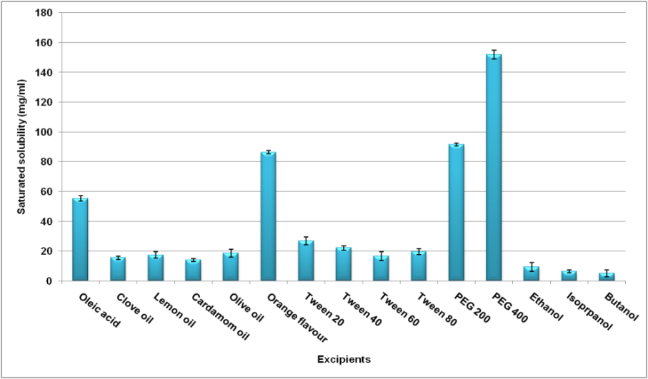 Fig. 2: Saturated solubility of montelukast sodium in different excipients (Results are expressed as mean±SD, n=3)