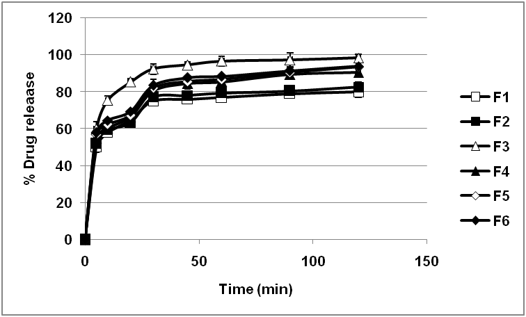 Fig. 3: In vitro release profile for montelukast NE (F1-F6) in 0.1 N HCl (Results are expressed as mean±SD, n=3)