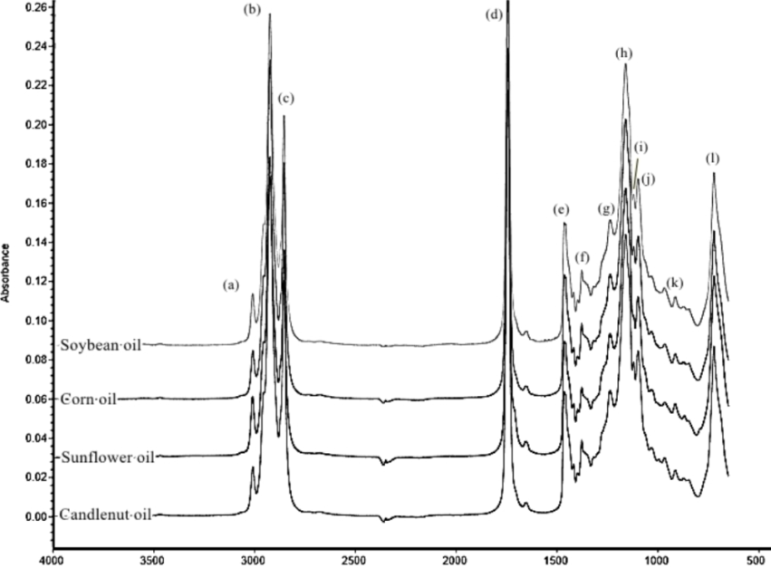 Fig. 2 revealed FTIR spectra candlenut oil, sunflower oil, corn oil and soybean oil scanned using FTIR spectroscopy at mid infrared region (4000-650 cm-1) which were characteristic to triacilglyceride of infrared absoption. The interpretation of each peakas can be seen in Lerma-Garcia et al. [15] and Rohman [13]. The main functional groups were: (a) cis CH=CH stretching vibration appeared in wavenumbers (1/λ) of 3008 cm-1, (b)–CH3 stretching vibration in 1/λ of 2953 cm-1, (c)–CH3 stretching vibration in 1/λ of 2953 cm-1, (d) very intense absorption of carbonyl (C=O) stretching vibration at 1/λ of 1741 cm-1, (e) 1460 cm-1 corresponding to CH2 bending, (f) 1378 cm-1 due to CH3 bending, while (g) at 1235 cm-1, (h) at 1159 cm-1, (i) at 1118 cm-1, (j) at 1098 cm-1 were corresponding to C-O stretching. All these functional groups are present in triglyceridic compounds.