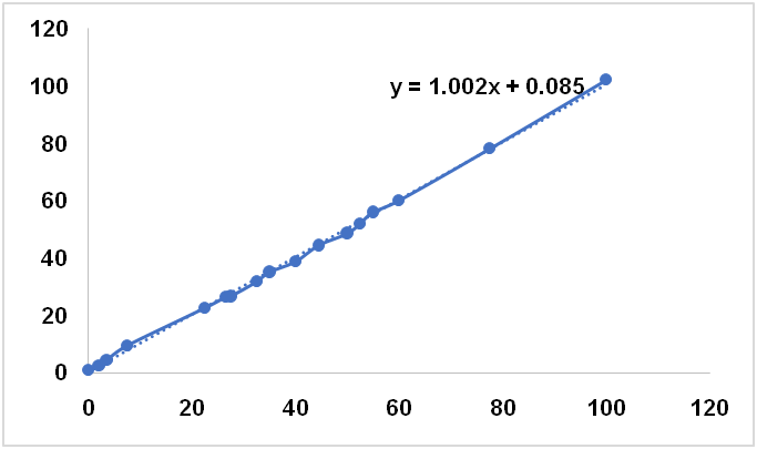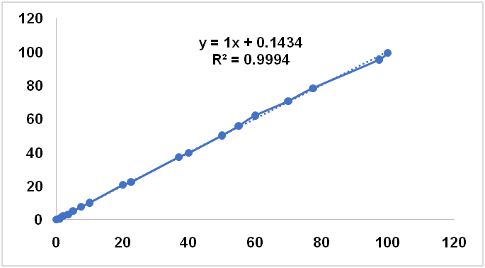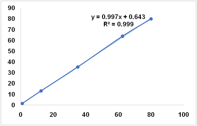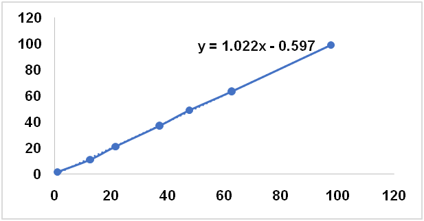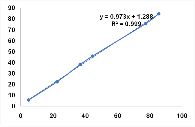 Table 1 compiled the performance of PCR and PLSR for quantification of CnO in SFO, CO and SyO in terms of R2, RMSEC, and RMSEP values using several wavenumbers region and spectral treatments (normal, first derivate and second derivate). Based on highest R2 either in calibration and validation samples and lowest RMSEC and RMSEP values obtained, CnO in SFO was quantified using PCR at wavenumbers region of 3100-2800 cm-1 using FTIR normal spectra With R2 calibration of 0.9990, R2 validation of 0.997, RMSEC of 1.52% and RMSEP of 1.56%. In addition, CnO in SyO was analyzed using PLSR with normal spectra in the combined wavenumbers of 1765-1625 and 839-663 cm-1. Finally, the normal spectra at wavenumbers region of 970-857 was selected for quantification of CnO in binary mixture with CO.