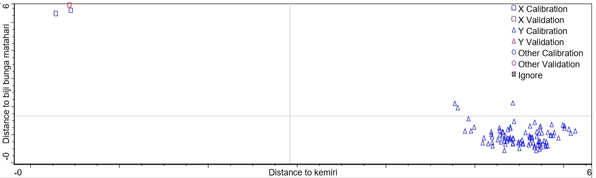 Fig. 5: The Coomans plot for the classification of candlenut oil (□) and candlenut oil adulterated with other oils (∆), namely sunflower oil (top), soybean oil (middle), and corn oil (down)