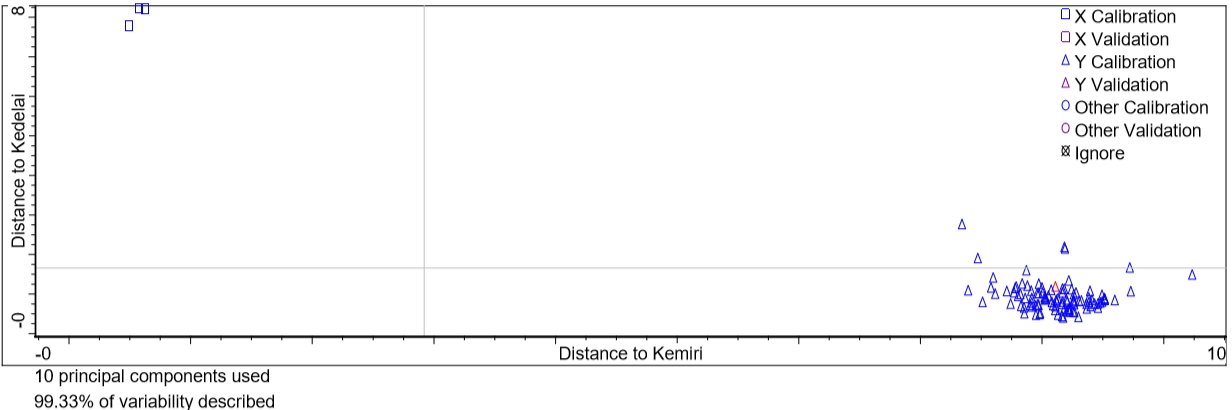 In order to make classification between authentic CnO and CnO adulterated with other vegetable oils (SFO, SyO and CO), discriminant analysis (DA) was used. DA is one of supervised pattern recognition technique based on linear discriminant function, which is a linear combination of the original measured variables [26]. During classification using DA, the absorbances at selected wavenumbers regions was chosen such a way that they provide clear separation between two-classes of samples. Fig. 5 revealed the Coomans plot for discrimination between CnO and CnO adulterated with SFO (using absorbance at wavenumbers of 3100-2800 cm-1), SyO (at 1765-1625 cm-1 and 839-663 cm-1), and with CO (at wavenumbers of 1125-1111 cm-1). The accuracy levels of 100% were obtained meaning that misclassification did not occur. Sometimes, if the studied oils have close similarity between authentic and adulterated oils, misclassification may occur, and then the model of DA must be re-optimized.