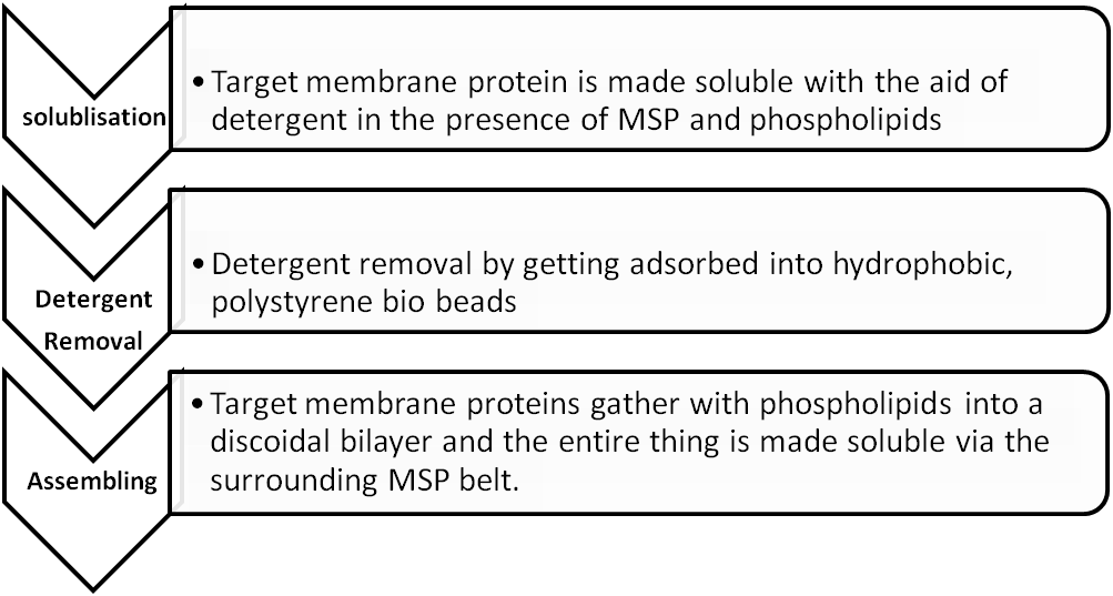 The first step involved in the synthesis of nanodisc is to collaborate together the MSP of appropriate class with the particular phospholipid or the detergent micelle. It is then followed by the elimination or removal of the detergent used [56]. As mentioned earlier, the size and stoichiometry of the nanodisc is being determined by the length of the scaffold protein that has been used. The MSP is actually a belt like structure that is wrapped around the protein. Next step is the determination of the phospholipid: MSP. This is a crucial step for the efficous assembling of nanodiscs. This has to be determined exactly for each new combination of MSP, the phospholipid and the protein. Then the protein solubilised in detergent is added to the disc mix. It has to be made ensured that this step is being done prior to the removal of the detergent. Thus the membrane protein has been merged into the nanodiscs. The major steps involving solublisation, detergent removal as well as assembling helps in the effective nanodisc synthesis and has been shown in fig. 2.