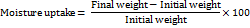 Pre-weighed patches (5 no.) were placed in the desiccator containing 100 ml of saturated potassium chloride solution and kept for 24 h. Next day, the weight of each patch was recorded. Moisture uptake was calculated using the following formula.