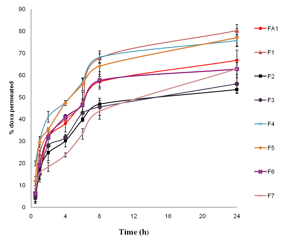 Fig. 2: In vitro permeation of doxa from TDDS containing various permeation enhancers. The values are mean±standard deviation of n=3. Key: FA1-TDDS with no enhancer, F1-with Transcutol®, F2-with oleic acid, F3-with isostearic acid, F4-with benzyl alcohol, F5-with dimethyl sulfoxide, F6-with propylene carbonate, F7-with dimethyl isosorbide