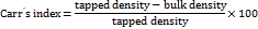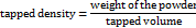 The cylinder was allowed to fall under its own weight onto a hard surface from the height of 2.5 cm at 2 second intervals. The tapping was continued until no further change in volume was noted. Tapped density was calculated using the following formula [11].